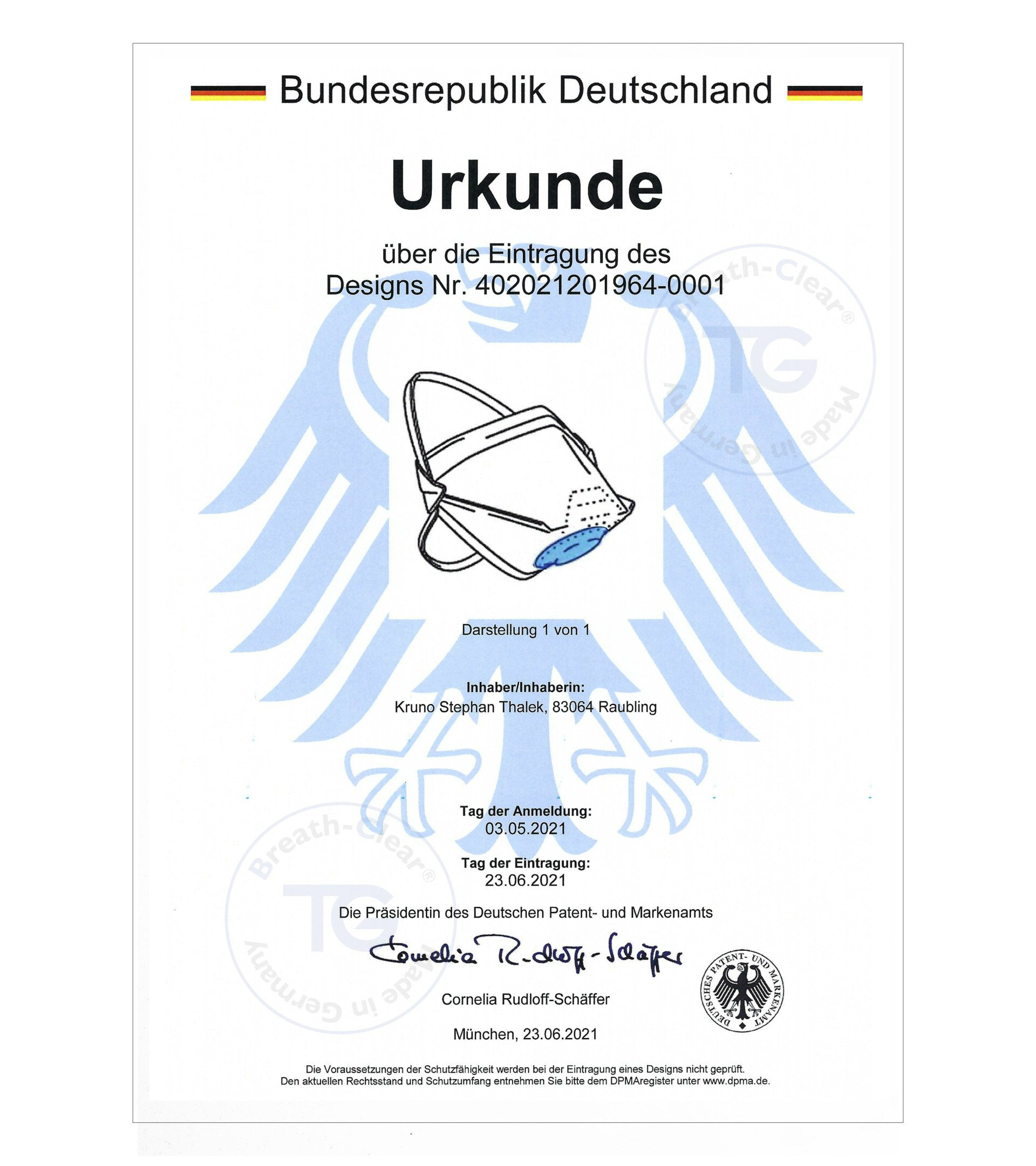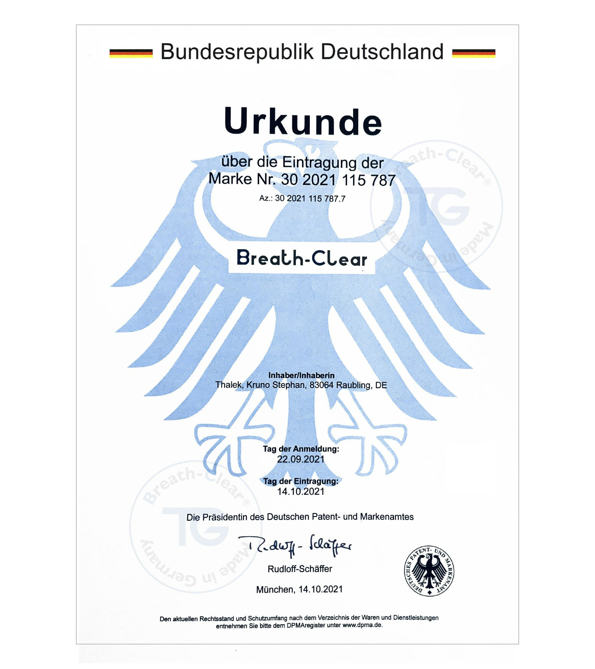 Bundesrepublik Deutschland - Urkunde über die Eintragung der Marke Nr. 30 2021 115 787 "Breath-Clear"