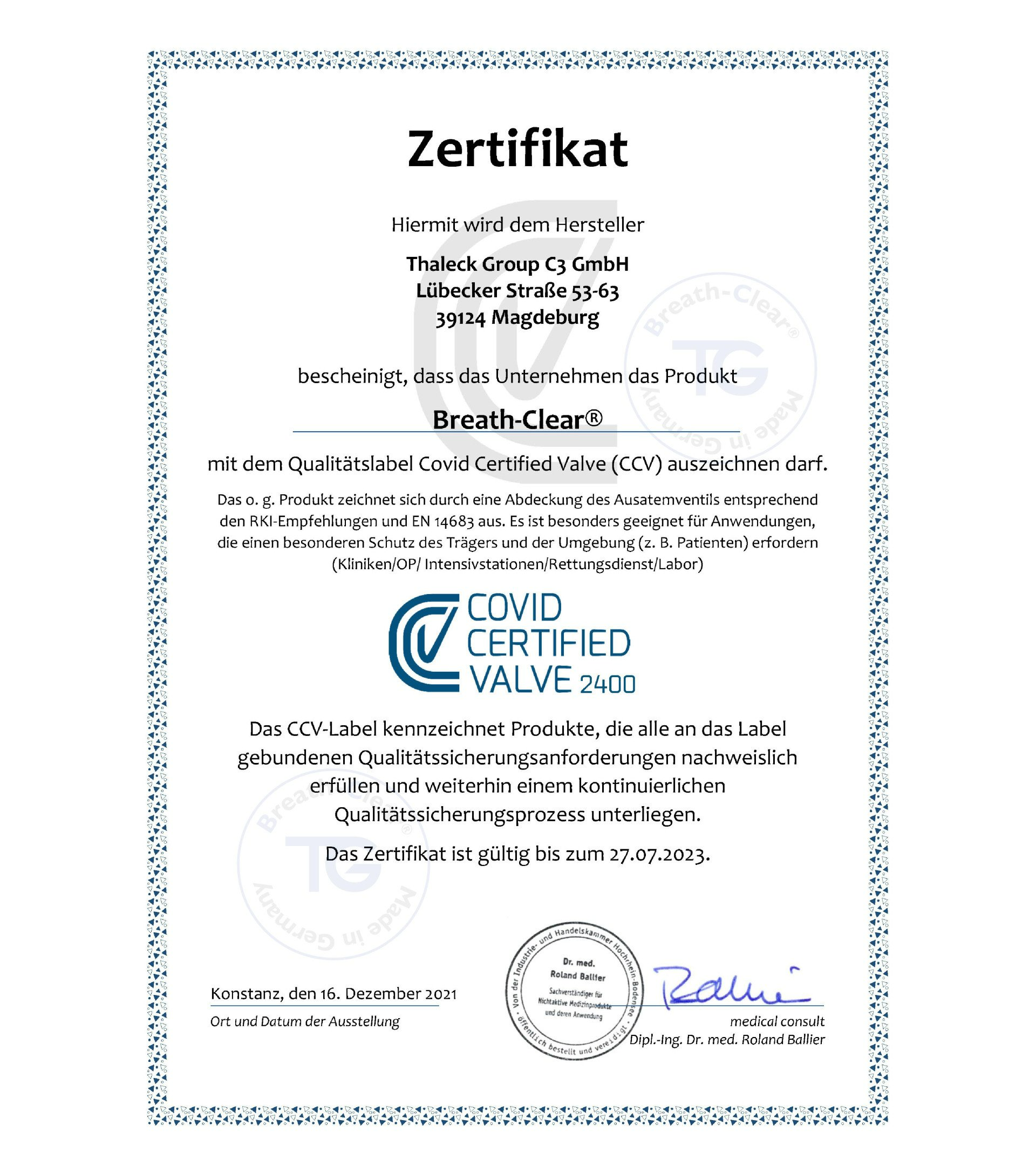 Zertifikat - Hiermit wird dem Hersteller "Thaleck Group C3 Gmbh" bescheinigt, dass Unternehmen das Produkt - Breath-Clear®